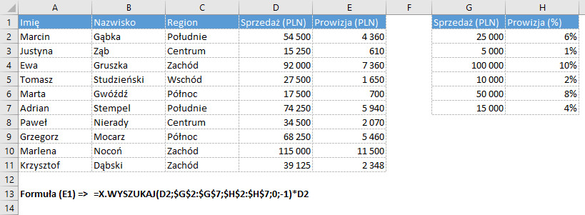W prezentowanym przykładzie obliczamy wysokość prowizji dla handlowców bazując na wielkości sprzedaży jaką wygenerowali.